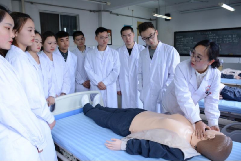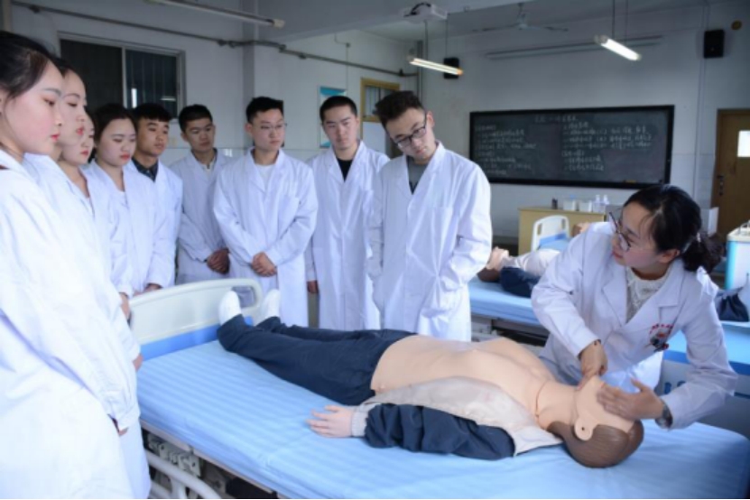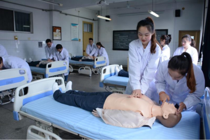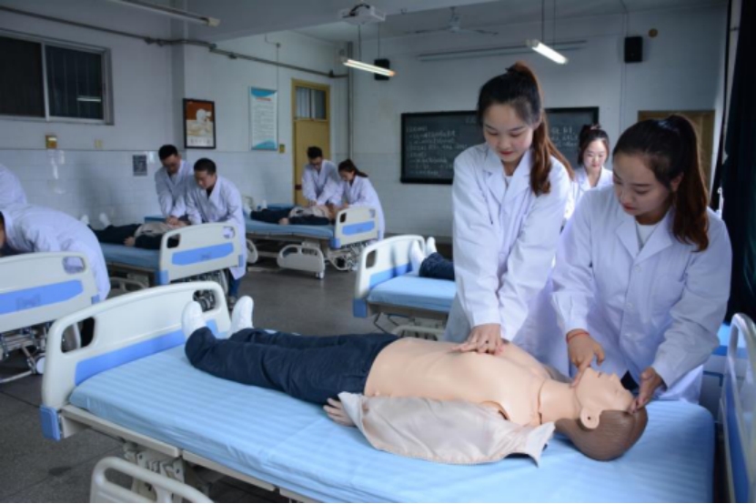 2.急救实训室:拥有院前急救综合训练心肺复苏模型人、云终端心肺复苏自主考核系统平台 、高级网络急救模型人、电除颤仪、简易呼吸器、气管插管模型、心电监护仪等,固定资产总值约120万元。能开展在校生的心肺初期复苏训练、进行胸外心脏按压、人工呼吸、电除颤、简易呼吸器的使用、气管插管术、心电监护仪的使用等,高级网络急救模型人高度仿真,该模型人可指导并纠正学生在操作中吹气、按压的力度、深度,抢救成功后,音乐声响起,电子模型人瞳孔缩小,可触及颈动脉搏动。学生可反复进行训练及考核,有利于提高急救技能,提升岗位胜任力。
