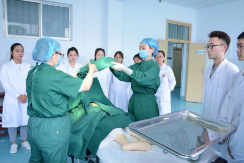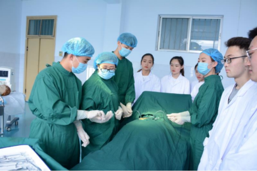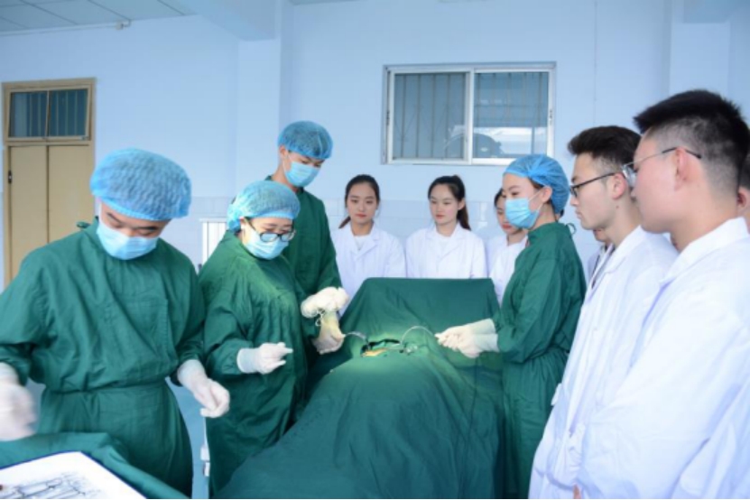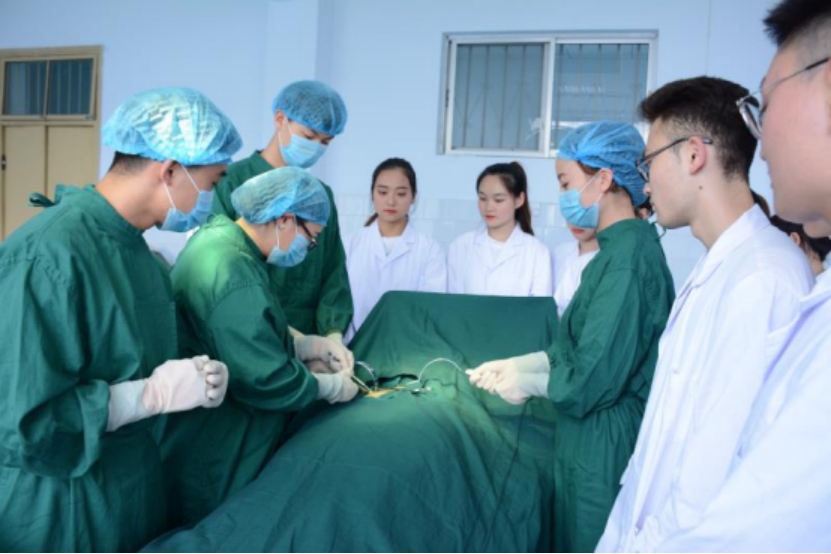 3.外总实训室:拥有缝合模块、清创模型、换药模型、包扎模型、缝合打结模型、胸膜腔闭式引流模型等,固定资产总值约70万元。能开展在校生的打结、缝合、清创术、换药术、包扎固定、胸膜腔闭式引流、进行动物试验、离体肠管吻合术等基本外科技能操作。各种模型设备功能先进,技术领先,贴近临床,学生可以反复进行训练及考核,有助于掌握外科基本技能,能快速适应临床工作。