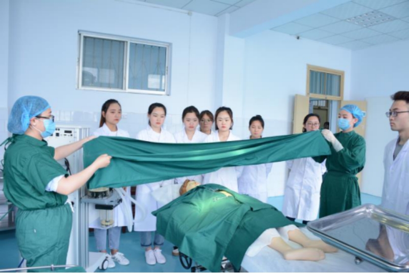 1.手术实训室:拥有呼吸机、麻醉机、无影灯、多功能手术床、各种手术器械、升降器械台、扇形器械台、无菌操作整体人、红外感应洗手设备、吸痰器、气压止血带、负压吸引瓶、多功能参数监护仪、抢救床等,固定资产总值约180万元。能开展在校生的外科术前洗手、穿无菌手术衣、戴无菌手套、术前消毒、铺无菌巾单、手术器械辨认、呼吸机及麻醉机的使用、多功能参数监护仪的使用等实训项目的训练及考核。外科手术示教室各种仪器设备功能先进,技术领先,贴近临床,学生可以反复进行训练及考核,有助于掌握外科手术基本技能,能快速适应临床工作。