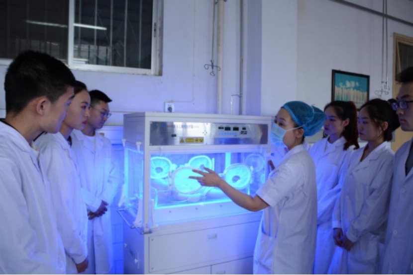 2.新生儿急救训练室内有婴儿模型、蓝光箱、婴儿培养箱、新生儿抢救台,可让学生学习婴儿包裹、哺乳、新生儿黄疸治疗的蓝光照射、早产儿及体温低下患儿体温的管理、新生儿抢救等实践技能。同时儿科实验室展柜内还陈列有高级儿童气管插管模型4套、高级婴儿头皮静脉穿刺训练模型8套,高级新生儿模型(四肢可弯曲,关节处有螺丝)12套,高级婴儿复苏模拟人2套、高级新生儿综合急救训练模拟人4套、高级婴儿护理模型4个。