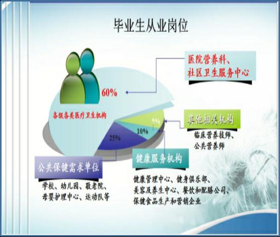 近年来,营养学知识正越来越多地应用于临床医学之中,营养疗法也迅速在我国普及。大中城市营养专业需求量不断加大,就业前景良好。毕业后能胜任在各级医疗卫生单位、各级食品卫生监督机构和各类餐饮业及食品加工流通企业、学校、幼儿园、企事业单位的公共食堂从事膳食营养的评价、管理和指导工作,还可从事营养食品教学、科研、食品卫生监督和检测、营养咨询等方面的工作。