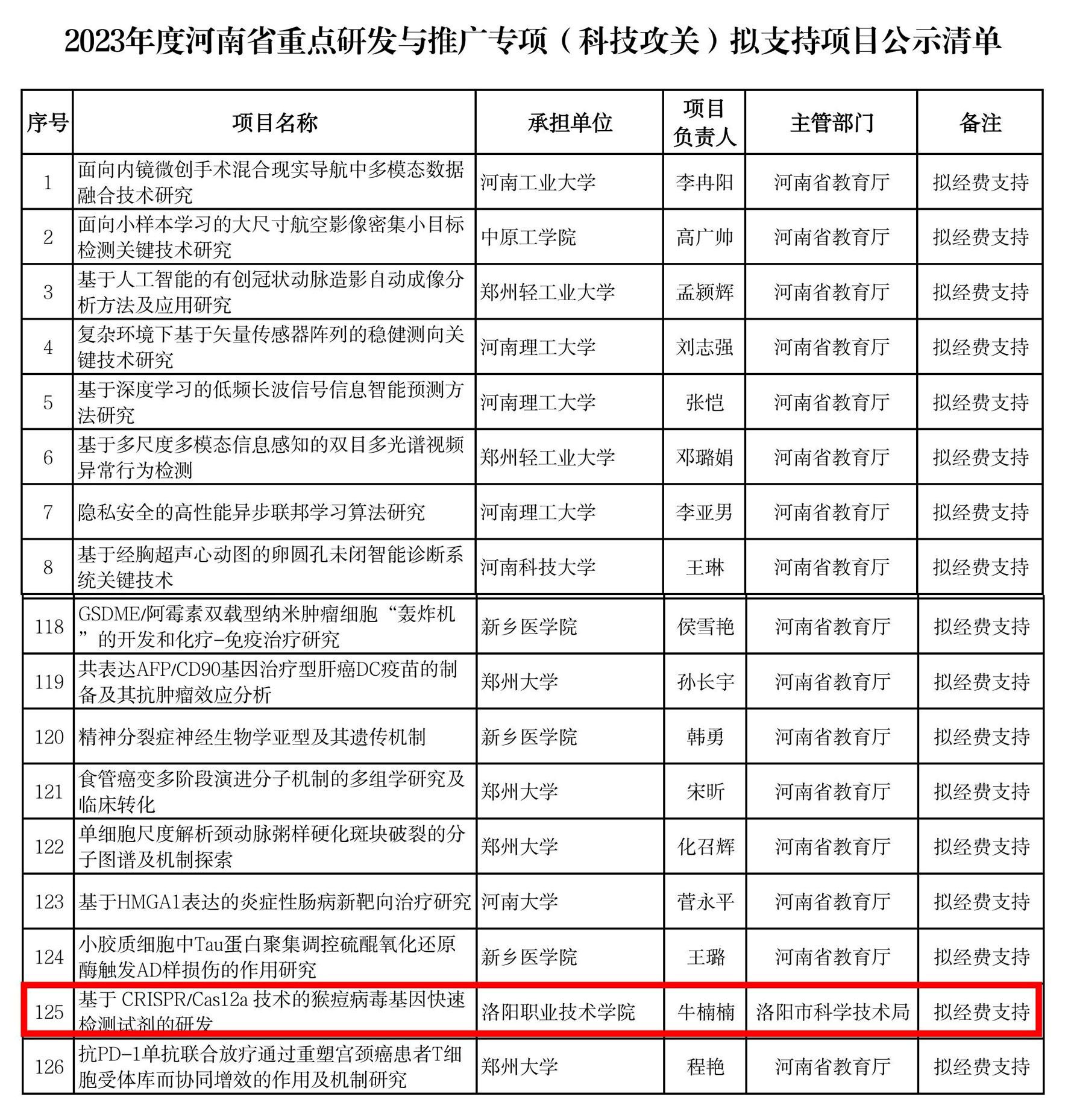 近日,河南省科技厅对2023年度河南省重点研发与推广专项(科技攻关)拟支持项目进行了公示。我院微生物学与免疫学教研室牛楠楠博士申报的“基于CRISPR/Cas12a技术的猴痘病毒基因快速检测试剂的研发”项目,获批10万元经费支持。
