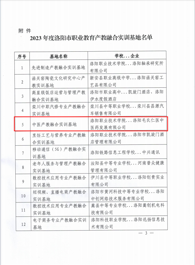 近期,洛阳市教育局、洛阳市发展和改革委员会公布了2023年度洛阳市职业教育产教融合实训基地名单。基础医学院与洛阳毛氏仁医中医药发展有限公司申报的“中医产教融合实训基地”成功获批。