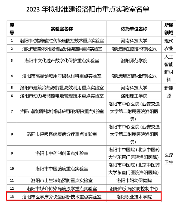 7 | 洛阳市医学床旁快速诊断技术重点实验室 | 洛阳市科技局 | 2023.10 |