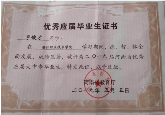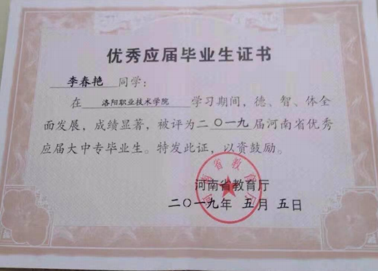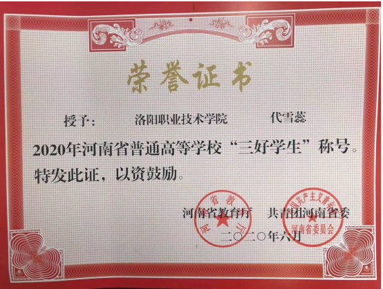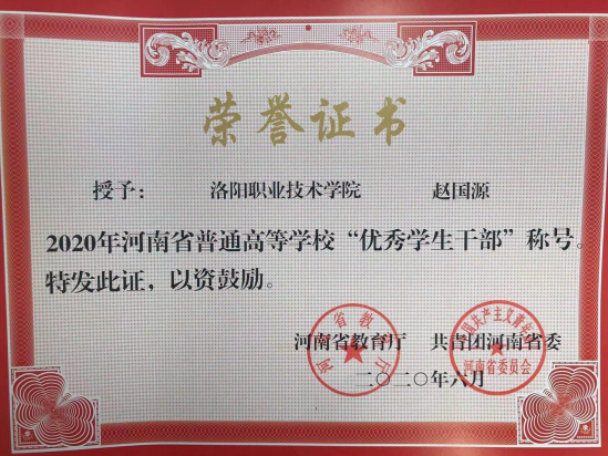 尹苗苗,2020年6月,河南省优秀学生干部;