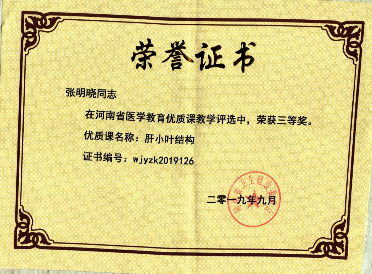 张明晓,河南省医学教育优质课教学评选中,荣获三等奖
