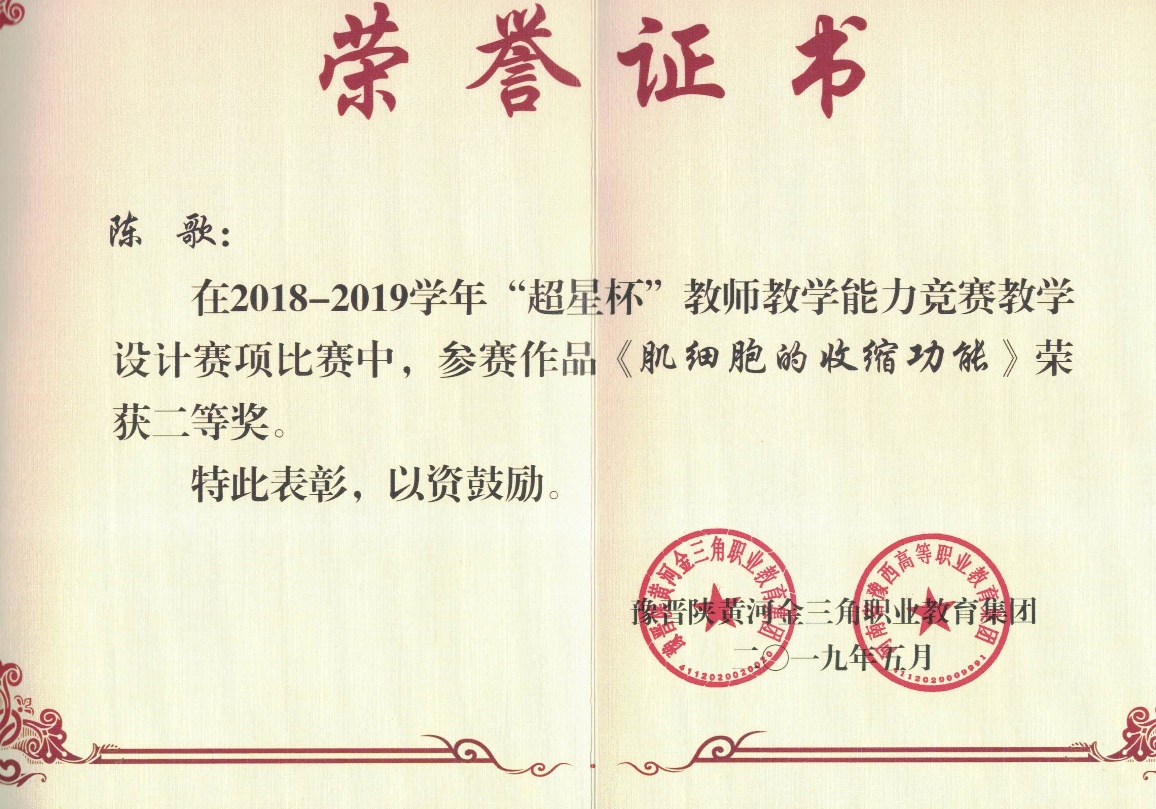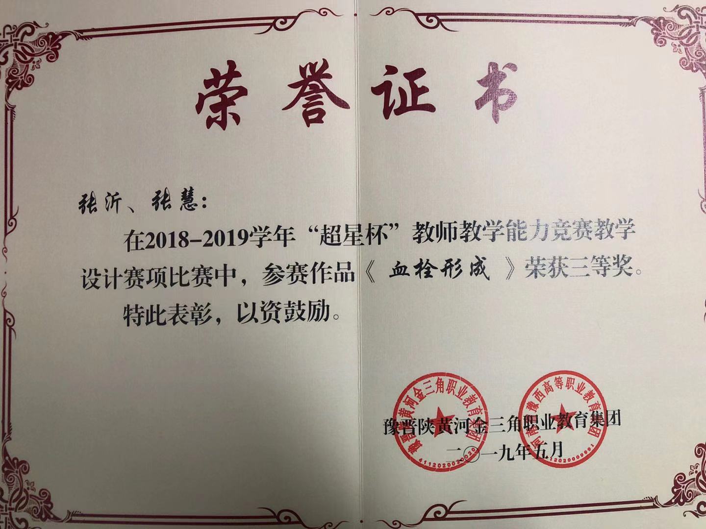 医学院陈歌老师、张沂老师在2018年参加豫晋陕黄河金三角“超星杯”教师教学能力竞赛,分别获教学设计赛项二等奖、三等奖。