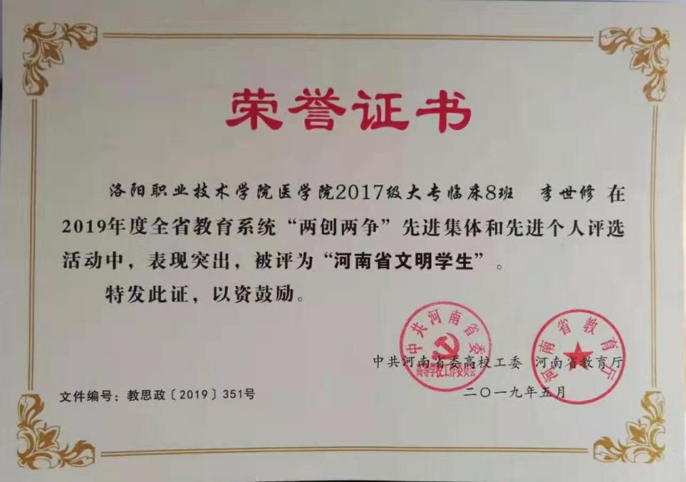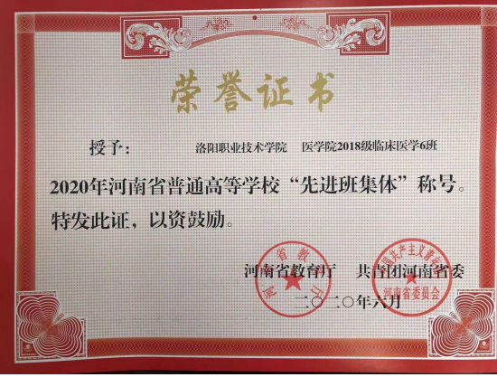18级临床医学6班,2020年6月,河南省先进班集体;
