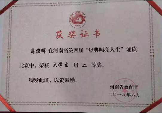 薄俊辉,2018年6月,河南省经典照亮人生二等奖;