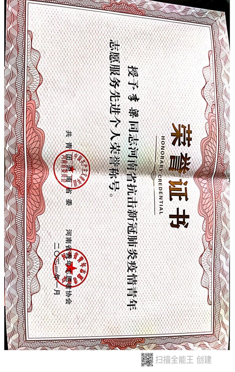 李梁,2021年1月河南省抗击新冠疫情肺炎青年志愿先进个人