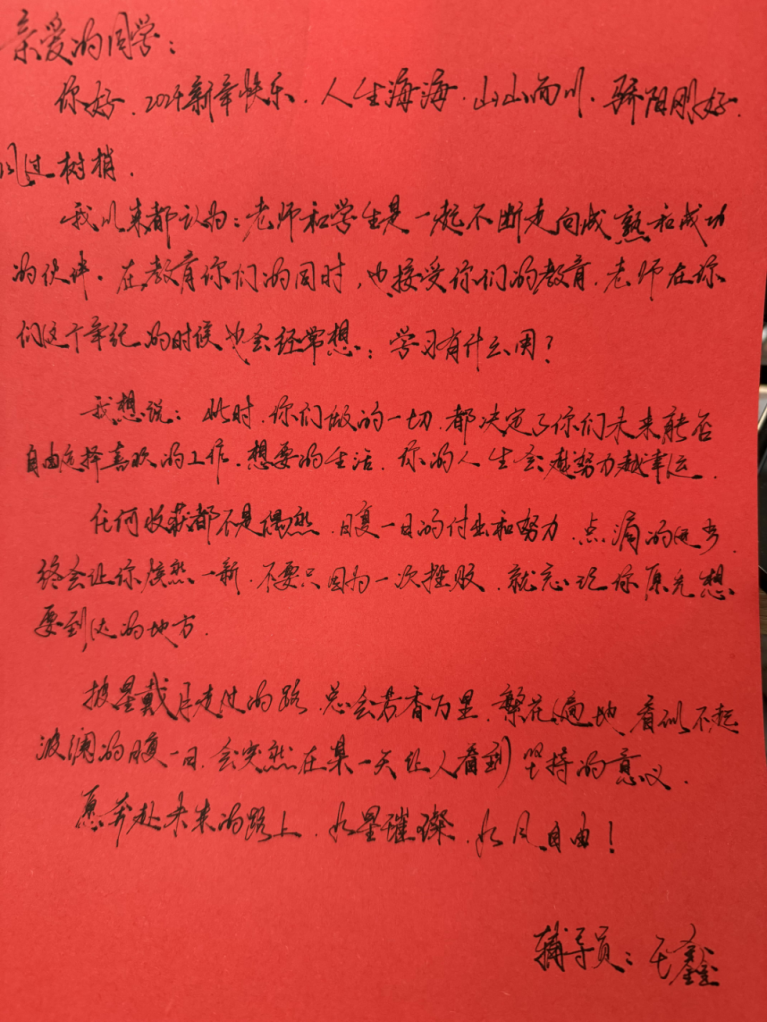 辅导员也送上了对学生的寄语。山海相隔,翘首以盼,寄情于语,尺素传情。2024年,亲爱的同学们愿你扬帆起航,书写出属于自己的精彩华章!