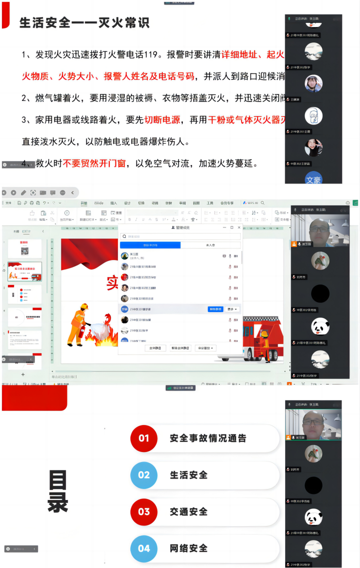 随后,各班辅导员通过线上会议向各自班级学生传达了学校的学生安全工作会议精神,结合现实生活中的具体案例分别从寒假期间的旅游安全、饮食安全、交通安全、网络安全、健康安全、心理安全、寒假打工安全等方面叮嘱学生提高安全防范意识,规范个人行为,注意自身安全。