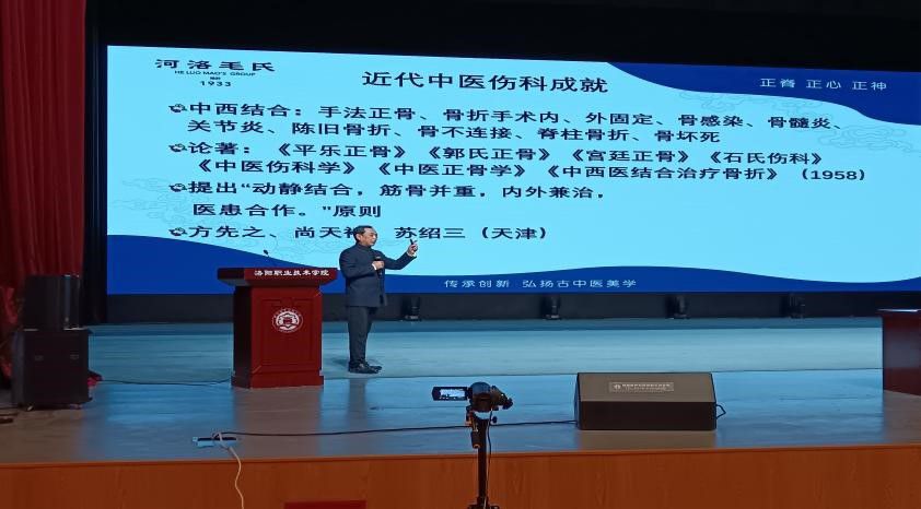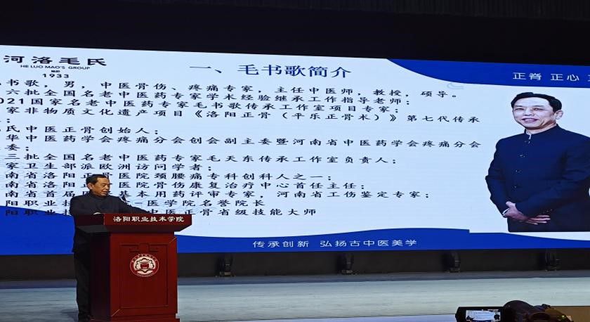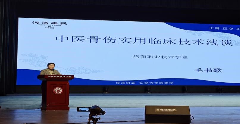 会上“毛氏正骨第四代传人”——毛书歌教授为中医学专业的学生们讲述中医骨伤的知识,并通过临床病例让大家更加明确中医骨伤的文化内涵。首先,毛书歌教授为大家讲述了中医骨科历史以及骨科的传承与发展。之后,毛书歌教授重点讲述了中医正骨在实训时的理论要求与重点,讲求中医骨科要“正脊、 正心 、正神”。最后,结合实用案例用日常生活中的挫伤,扭伤等病症分析出原因并阐述治疗方法。