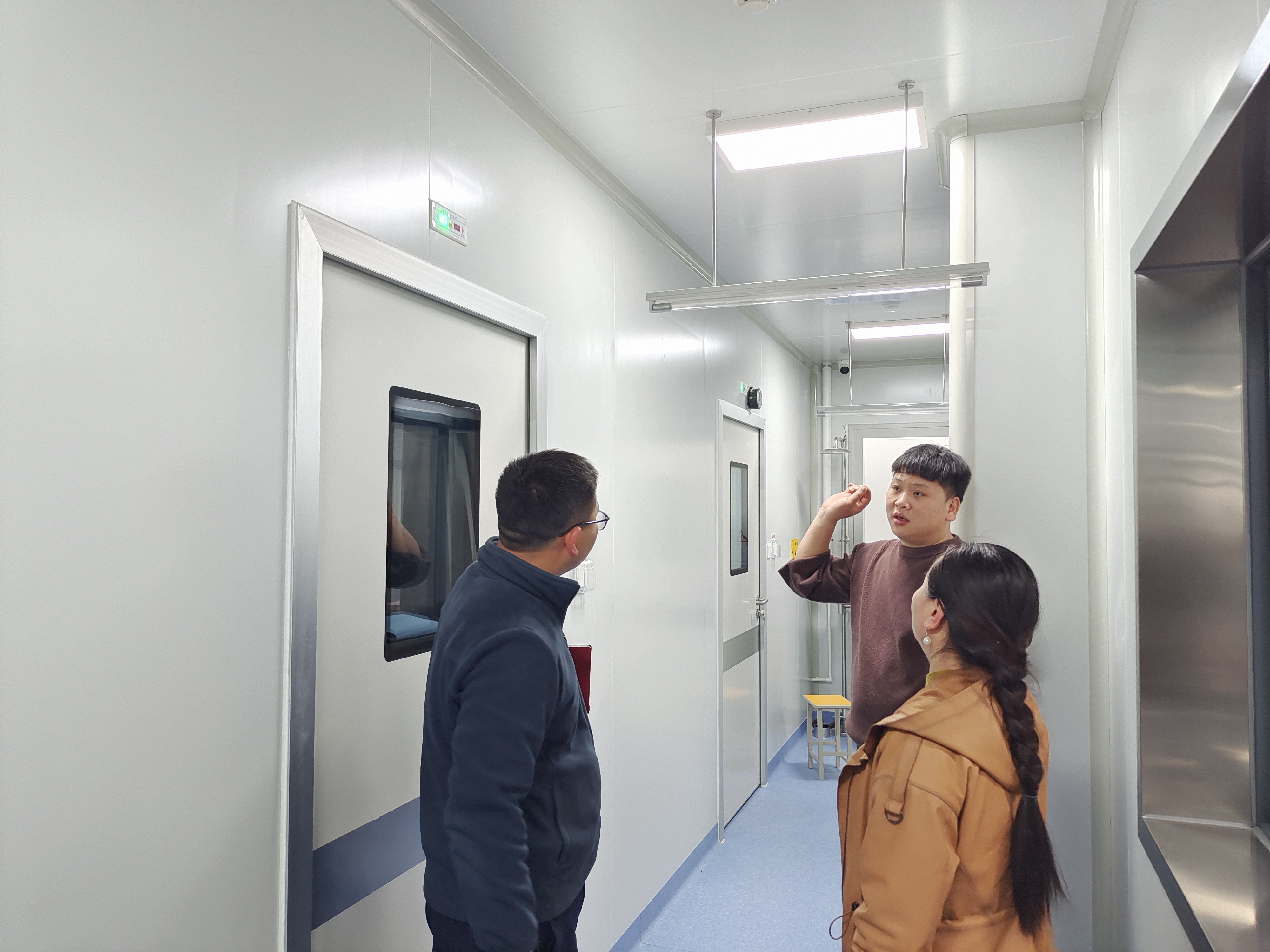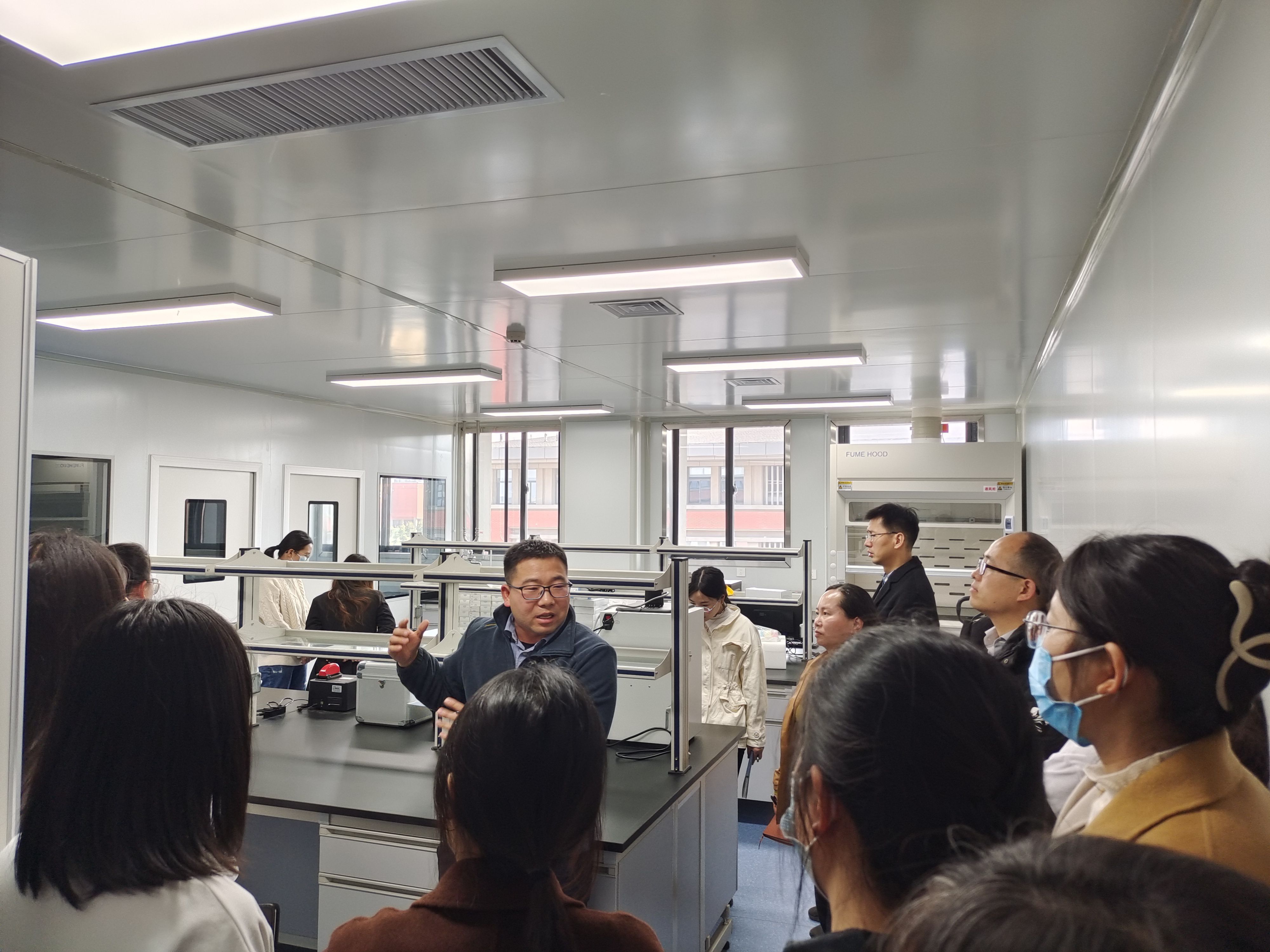 陈义祥博士和张卫凯博士带领科研人员参观实验室。