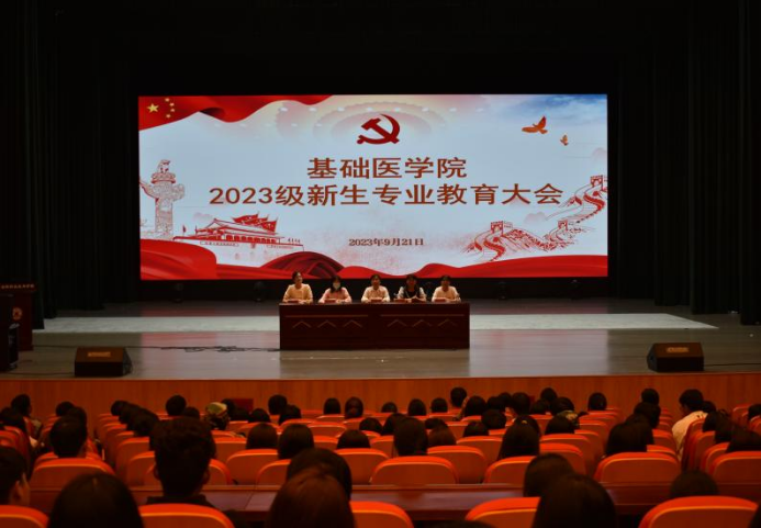 为帮助2023级新生尽快适应校园环境,提高对自身专业的认知与了解,增强对所学专业的认同感,9月21日晚,基础医学院在戏曲大礼堂召开2023级新生专业教育大会,基础医学院党总支书记崔颜宏、副院长杜学利、副书记李笑雯、教学办主任牛小艳,学工办主任曹琳珊出席会议,23级全体专兼职辅导员及2023级全体新生参会,会议由李笑雯主持。