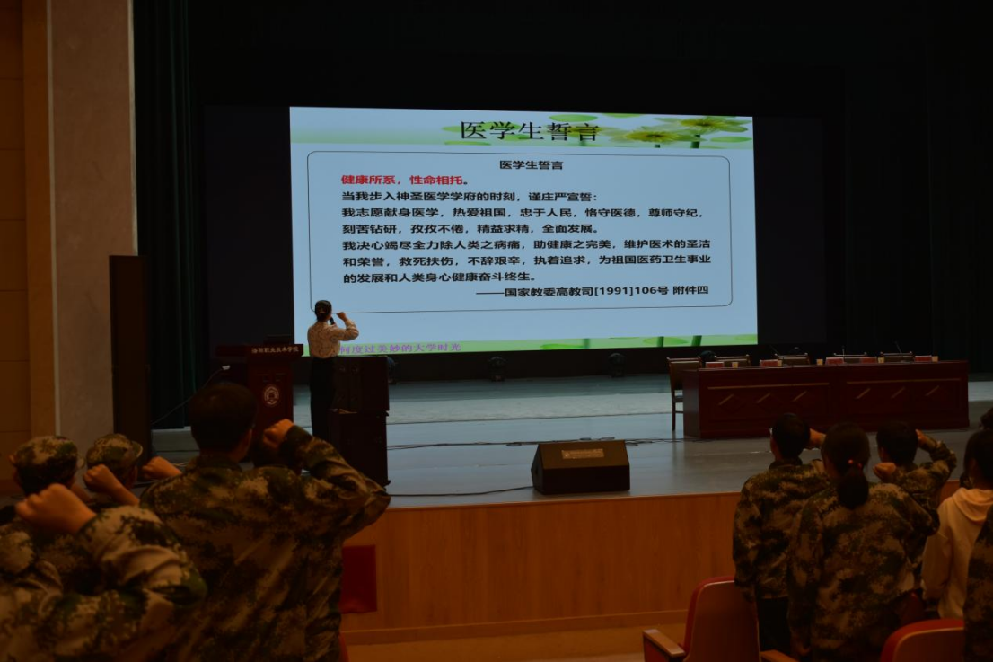 会议第三项,崔颜宏带领2023级全体学生进行医学生誓言宣誓。随后又从医学由来、青年医者身上的使命担当、大学三年我该怎么做三个方面对2023级新生们提出了很多有价值的意见和建议,希望同学们能牢记在心,充分把握学习机会,在大学期间不遗余力的追求知识与技能,学有所得、学有所获,规划好自己的大学生涯。