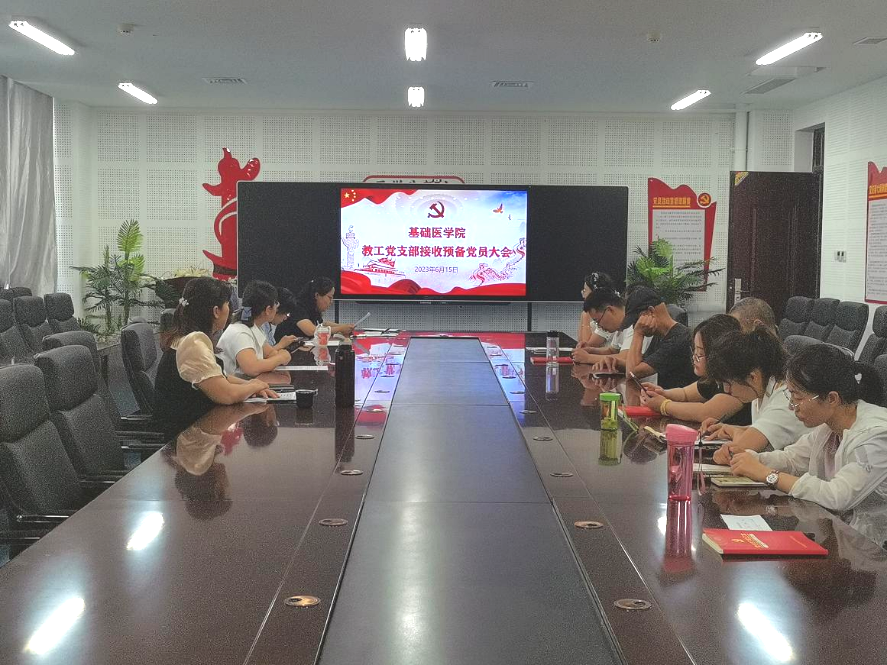 6月15号下午13:00在二号基础医学实训楼213会议室召开基础医学院教工党支部接收预备党员大会。参加此次会议人员为基础医学院全体党员,由郜乐乐主持此次接收会议。