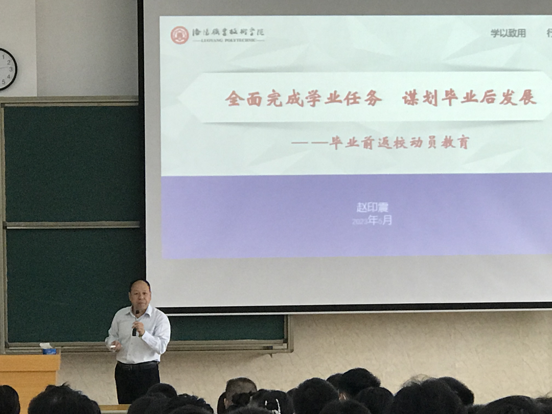 会上,赵印震就全面完成学业任务,谋划毕业后发展对全体2023届毕业生进行毕业前返校动员教育。主要围绕完成毕业考试任务,确保顺利毕业;积极参与助力全科培训,抢占职业主动权;以及调动多方资源,力争就业等方面进行讲解。