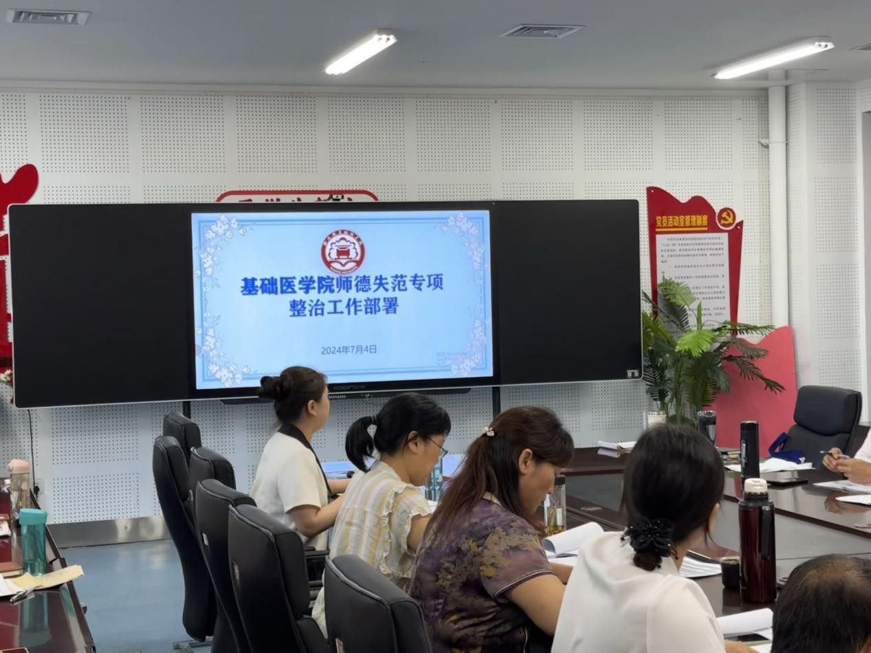 为进一步完善学校师德师风建设工作机制,规范教师行为,提升教师思想政治素质和职业道德水平,营造风清气正的育人环境,7月4日下午,基础医学院在8-213会议室召开师德失范问题专项整治工作部署会。