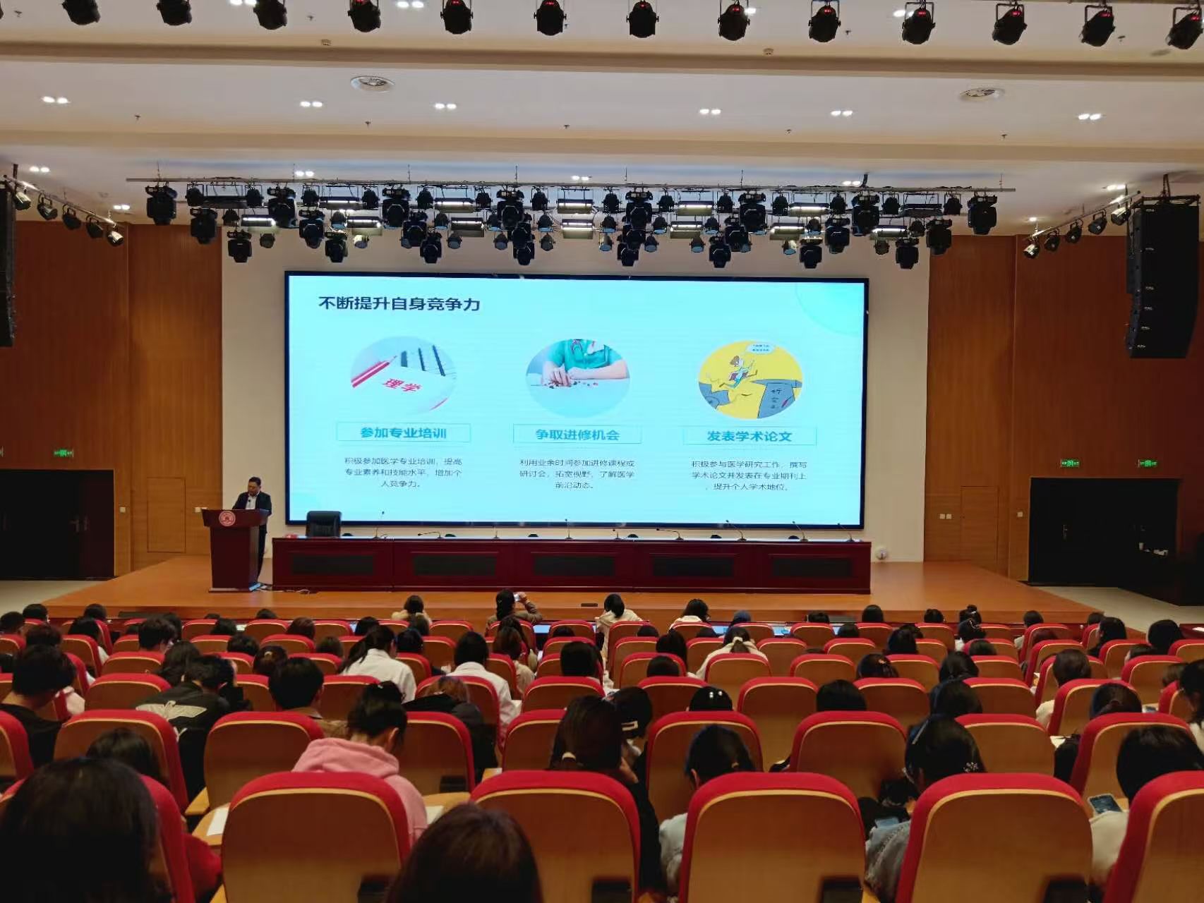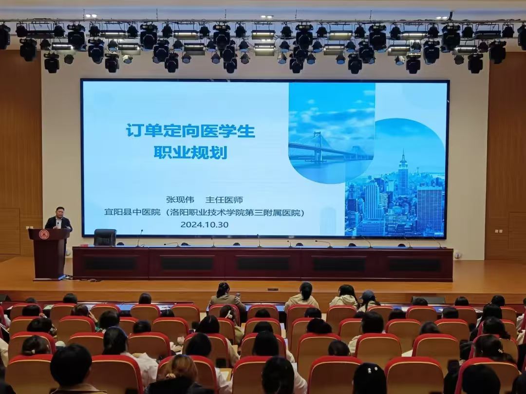 10月16日,基础医学院邀请洛阳职业技术学院第三附属医院(宜阳县中医院)的张现伟主任,于大学生活动中心主持开展了一场主题为“订单定向医学生职业规划”的专业思想教育讲座。本次讲座由基础医学院党总支书记崔颜宏主持,教学办主任牛小艳、综合办主任杨俊娜出席,23级临床医学专业、中医学专业订单班以及24级中医学专业订单班的学生积极参与。