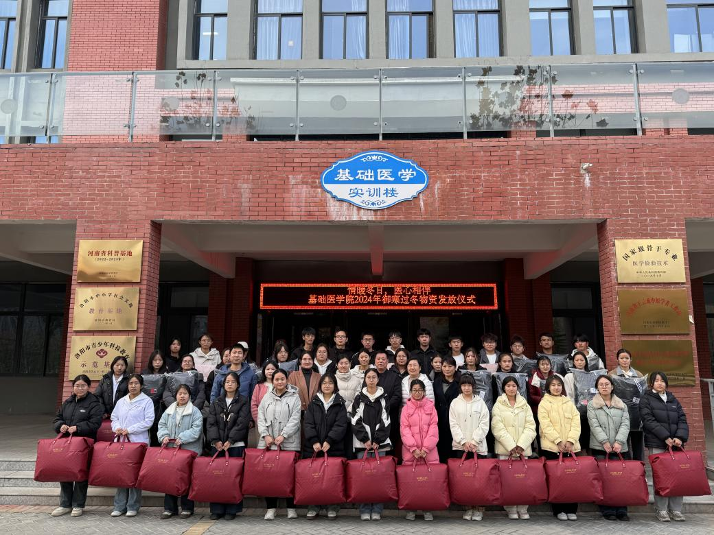 为落实国家资助政策,帮助家庭困难学生温暖过冬,12月6日,基础医学院在8-213会议室举办2024年越冬物资发放仪式。校领导、校关工委执行主任邓卫国出席发放仪式,学院领导班子、全体辅导员及受助同学参加活动。