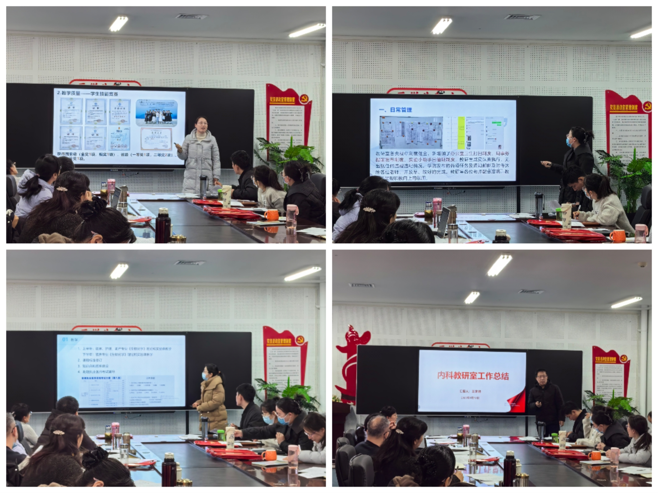 各教研室主任按照2024年教研室工作考核方案分别从专业建设、师资培养、教师竞赛、教研教改、教学成绩、科研业绩6个方面汇报了一年来教研室完成的工作情况,并对照教研室工作考核表中的考核指标完成评价。