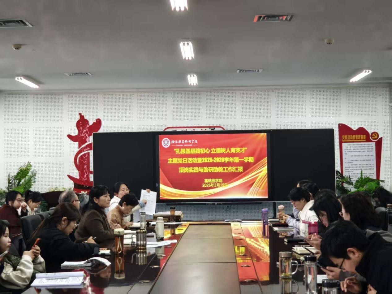 3月19日下午,基础医学院教工支部举办“扎根基层践初心,立德树人育英才”——主题党日活动。来自六家合作教学医院及高校的顶岗实践教师、全体党员、入党积极分子及相关教学人员齐聚一堂,通过理论学习、成果汇报、研讨交流和总结点评四个环节,推动党建工作与业务工作深度融合,共谋医学人才培养质量提升。