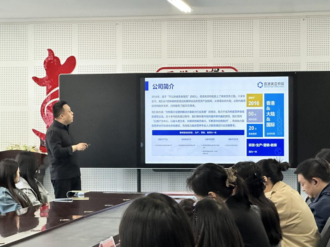 会议伊始,营养教研室负责人王玉霞与香港美亚特医营养科技(浙江)有限公司就学院专业建设、人才培养模式及企业用人需求等内容进行了深入交流,为后续合作奠定了良好基础。随后,香港美亚特医营养科技(浙江)有限公司人力资源部总监赵奇迹进行企业宣讲,全面介绍了公司发展历程、业务布局及实习就业岗位情况,让院方师生对企业有了更为清晰的了解。